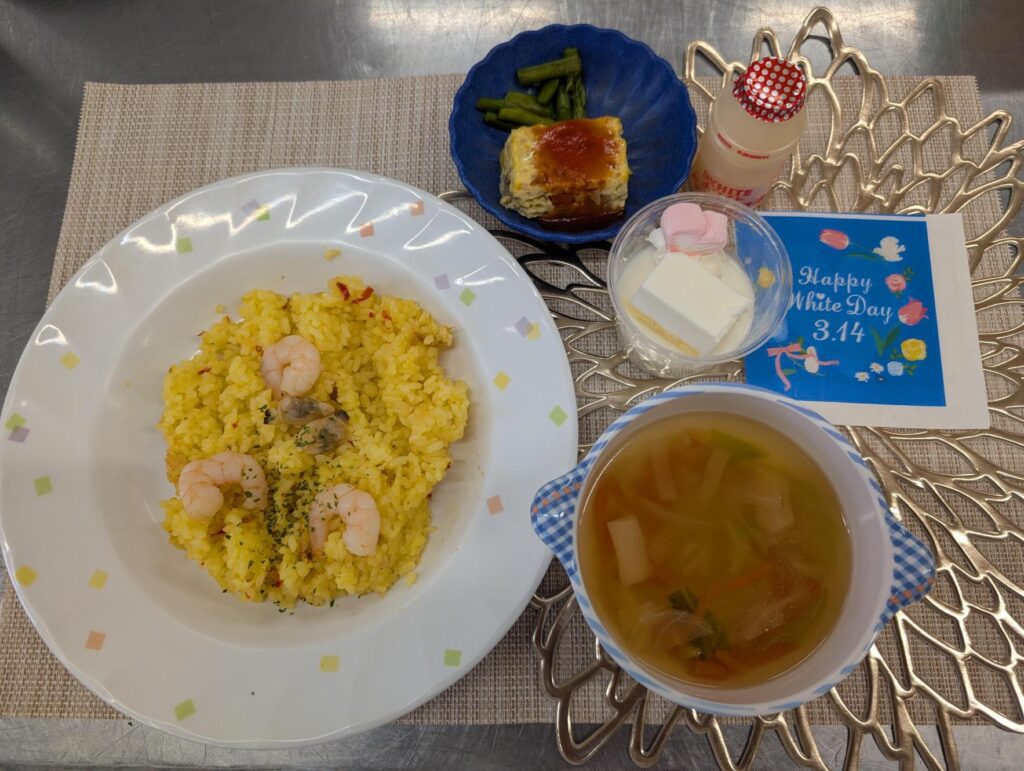 ❤ホワイトデーランチ❤2026年3月17日 🍫ホワイトデー❤ランチ🍫社会福祉法人 樅山会(もみやまかい) | Facebook 3/14のランチメニューは、ホワイトデーの特別メニューでした! 【パエリア・コンソメスープ・スペイン風オムレツ・ホワイトデーデザート・乳酸菌飲料】 「美味しい♪」と、皆さま笑顔で召し上がっておられました。 また、栄養課の職員がファミリーの皆さまへホワイトデーのチョコレートをプレゼント♪ 甘いチョコに笑顔あふれるひとときとなりました❤ カテゴリー:新着情報樅の木荘給食だより